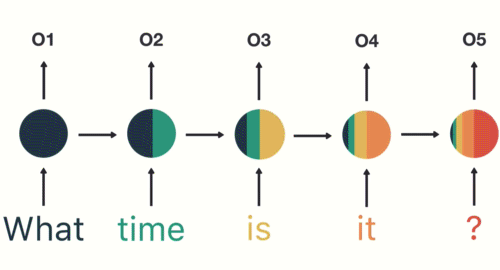 - 第三步: 继续将单词"time"输送给RNN, 但此时RNN不仅仅利用"time"来产生输出O2, 还会使用来自上一层隐层输出O1作为输入信息.