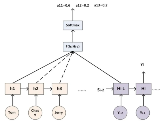 而每个Ci可能对应着不同的源语句子单词的注意力分配概率分布,比如对于上面的英汉翻译来说,其对应的信息可能如下: $$ C_{Tom}=g(0.6*f2(Tom), 0.2*f2(Chase), 0.2*f2(Jerry)) \\ C_{Chase}=g(0.2*f2(Tom), 0.7*f2(Chase), 0.1*f2(Jerry)) \\ C_{Jerry}=g(0.3*f2(Tom), 0.2*f2(Chase), 0.5*f2(Jerry)) $$