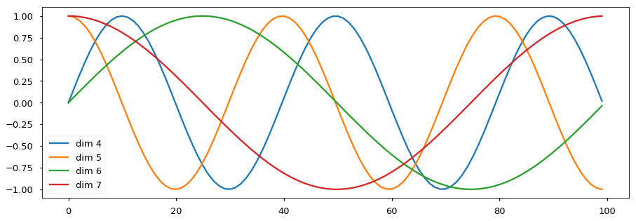 # # 第0个句子的,所有单词的,绘制4到8维度的特征 看看sin-cos曲线变化