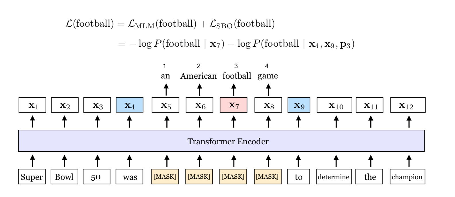 具体的做法: 在训练时取Span前后边界的两个词, 需要注意这两个词不在Span内, 然后用这两个词向量加上Span中被MASK掉的词的位置向量, 来预测原词.