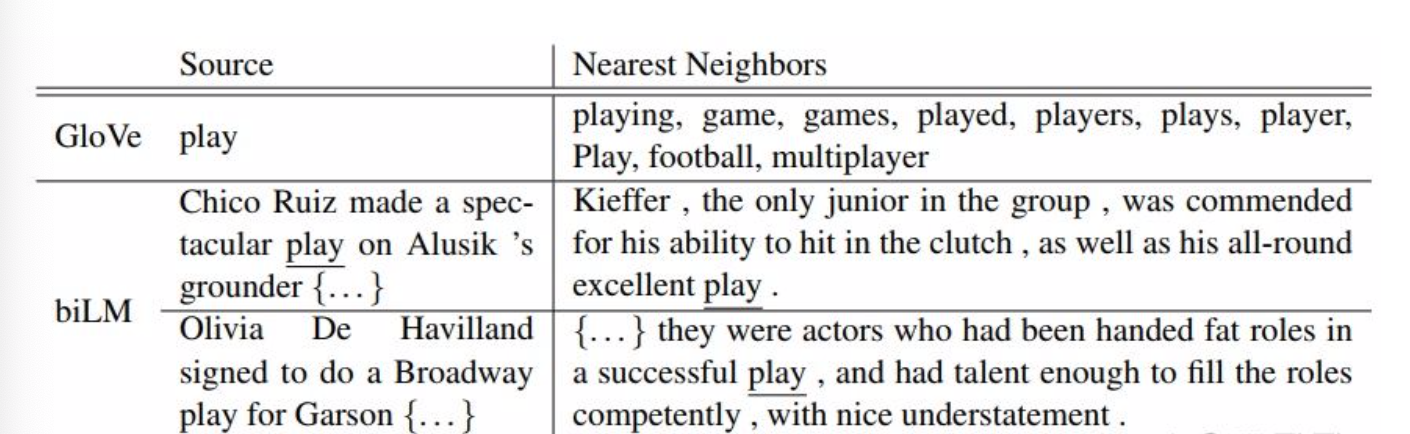 - 首先用一个语言模型学好一个单词的word embedding, 此时是无法区分多义词的, 但没关系. 当实际使用word embedding的时候, 该单词已经具备了特定的上下文信息, 这个时候可以根据上下文单词的语义去调整单词的word embedding表示, 这样经过调整后得到的word embedding向量就可以准确的表达单词在当前上下文中的真实含义了, 也就自然的解决了多义词问题.